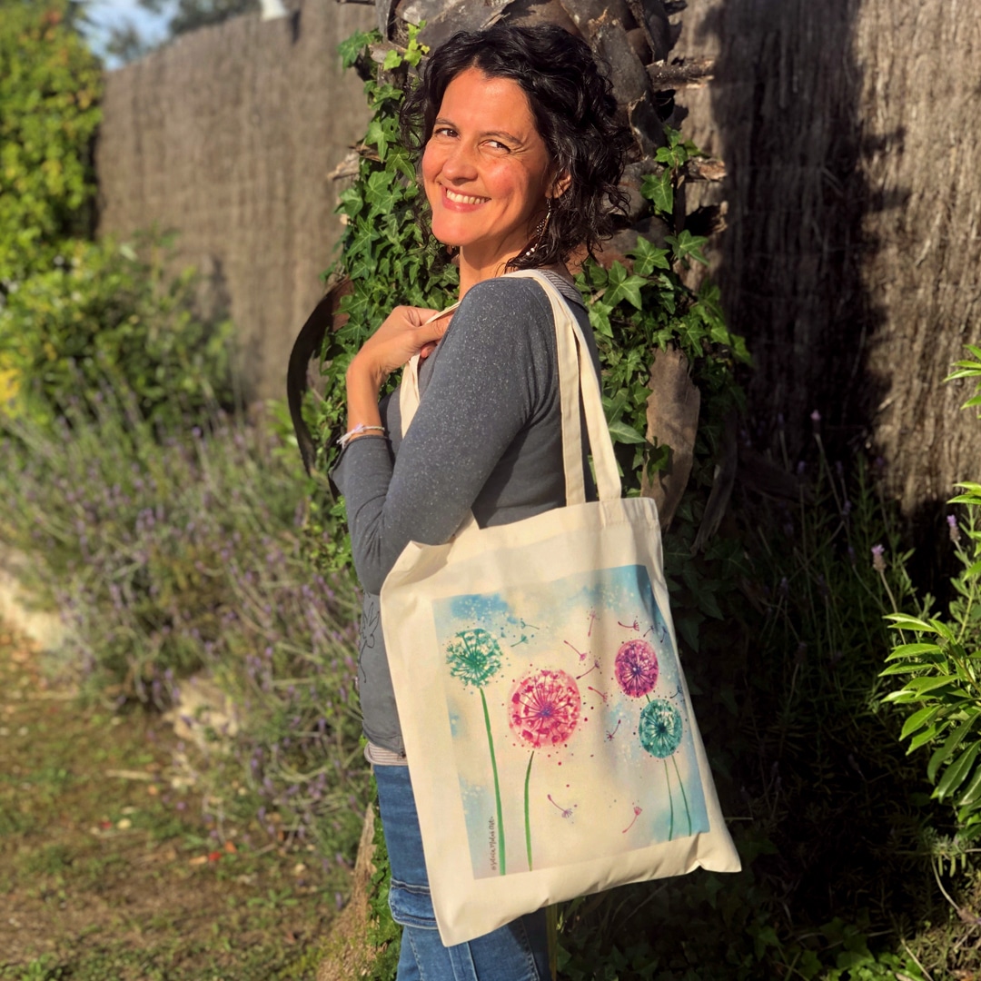 Bossa de cotó 100% (tote bag), en color natural de 140 gr amb la il·lustració ” Dent de lleó “.