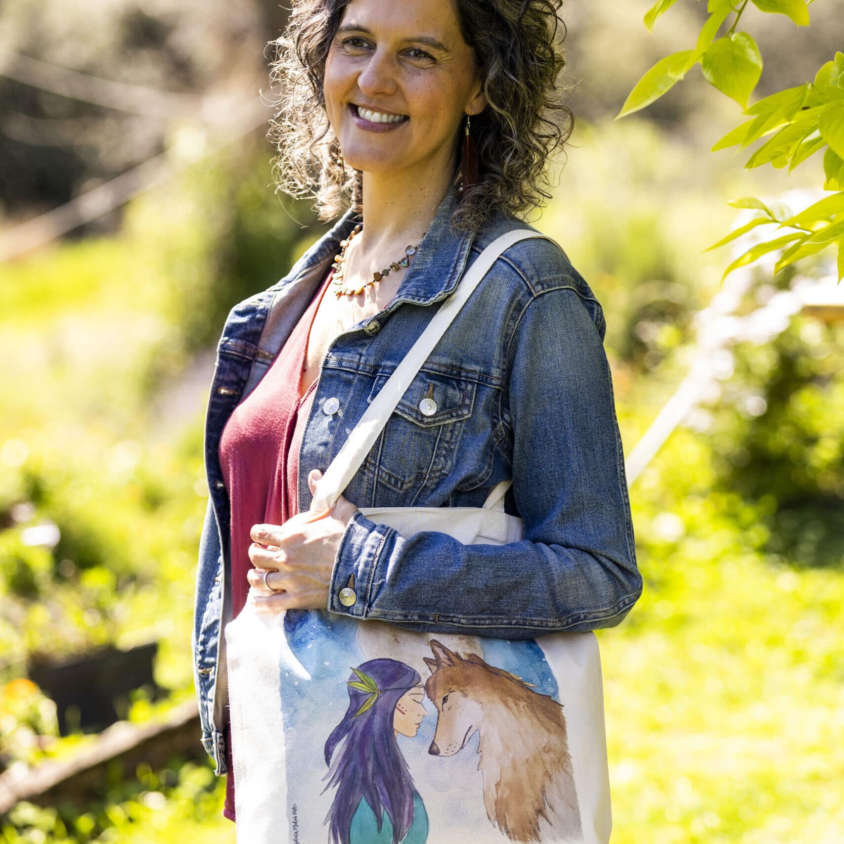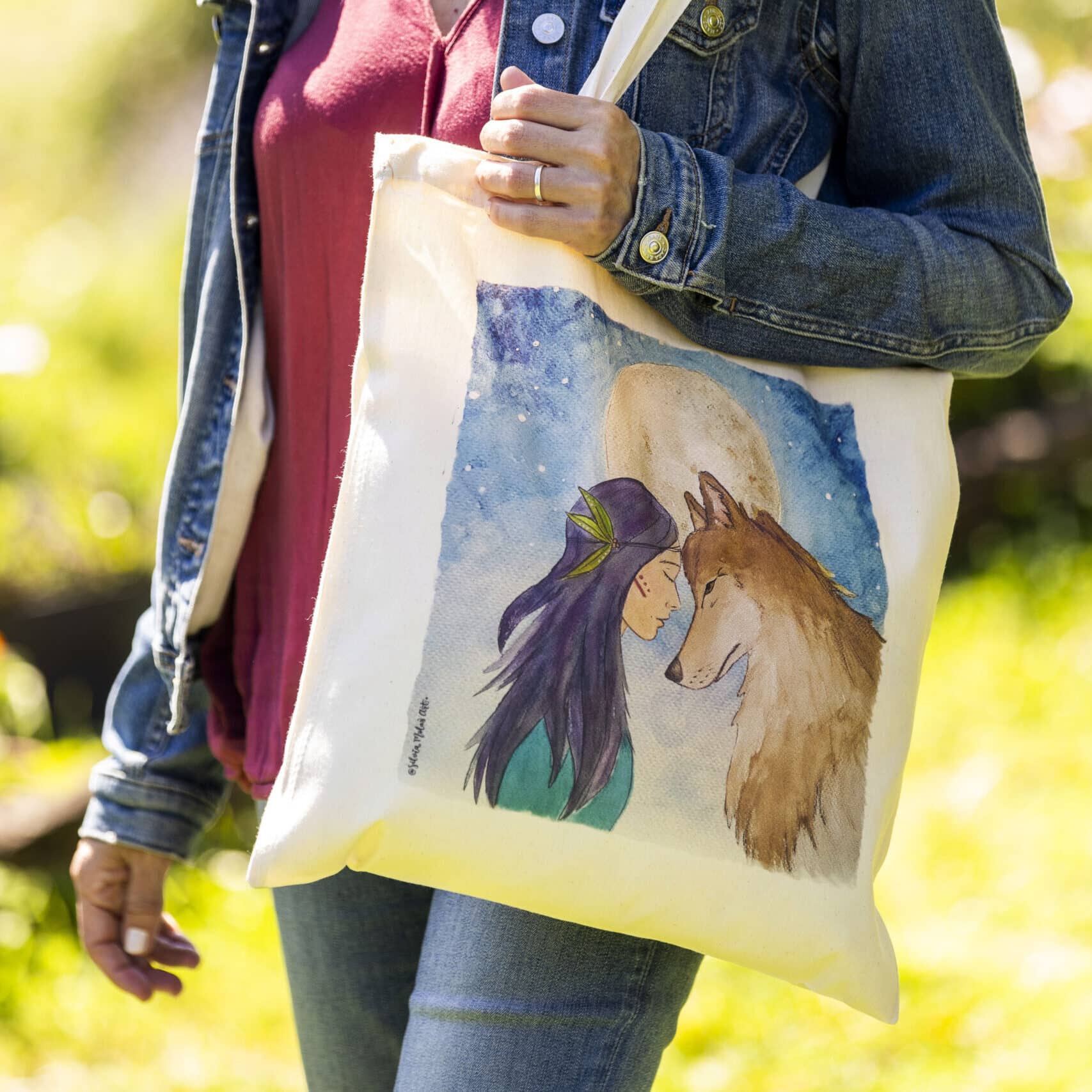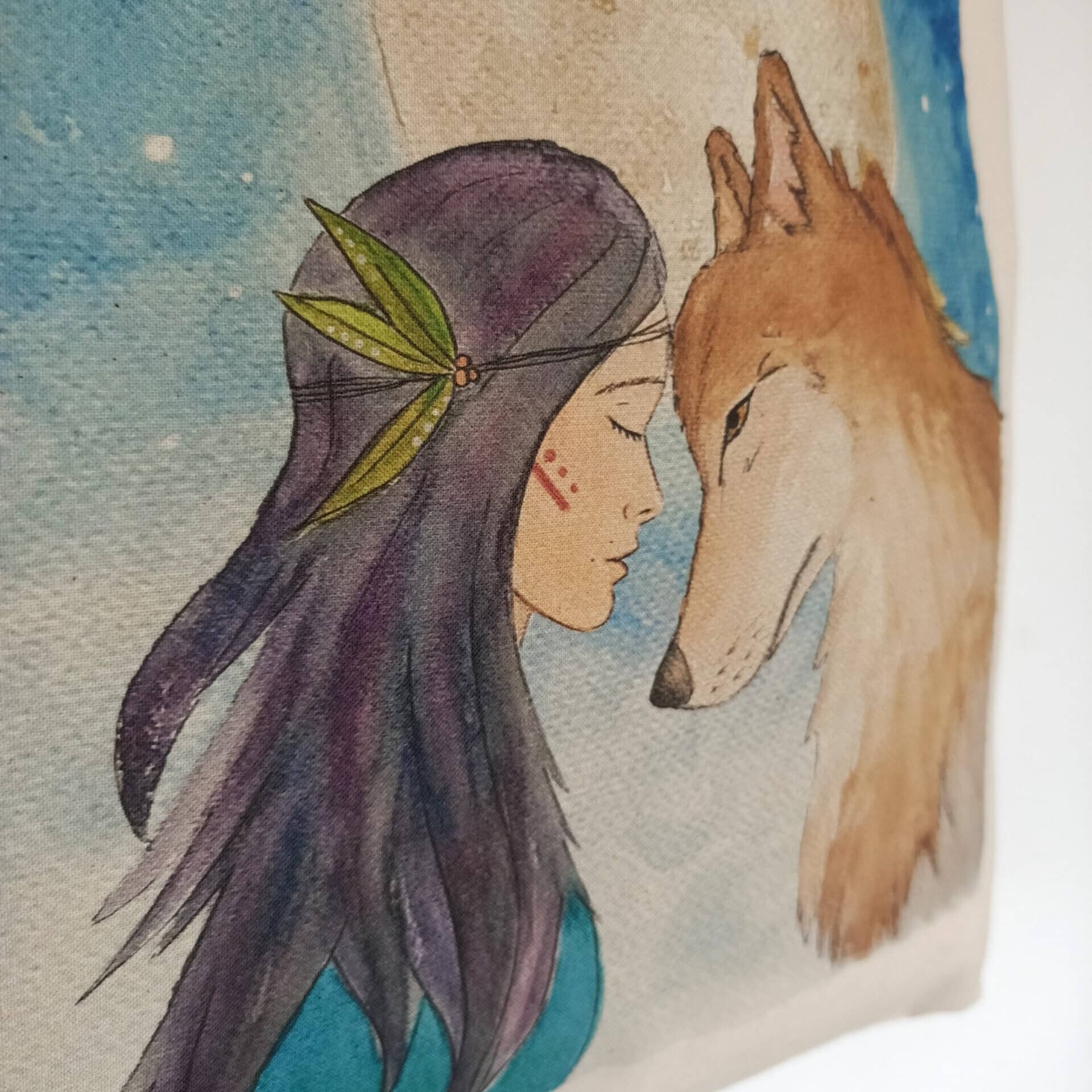 Bossa de cotó 100% (tote bag), en color natural de 140 gr amb la il·lustració “Dona y llop”.
