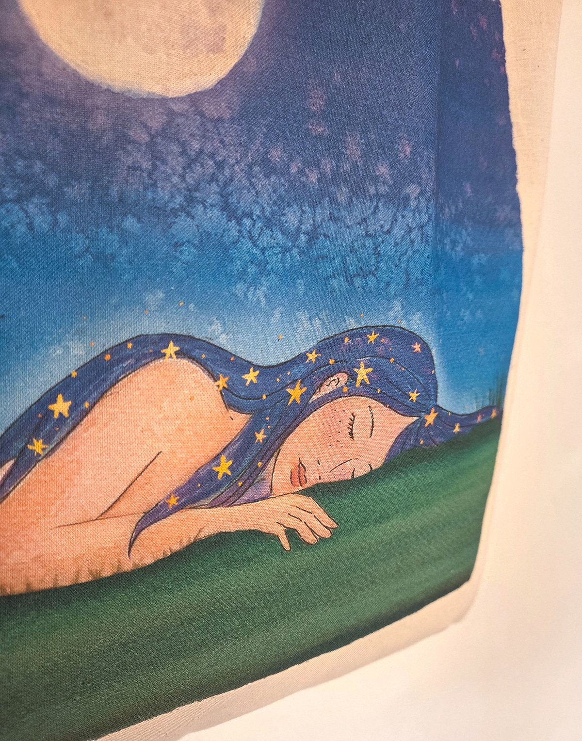 Bossa de cotó 100% (tote bag), en color natural de 140 gr amb la il·lustració “Dona i Lluna”.