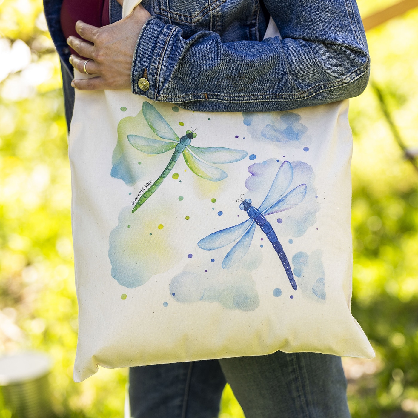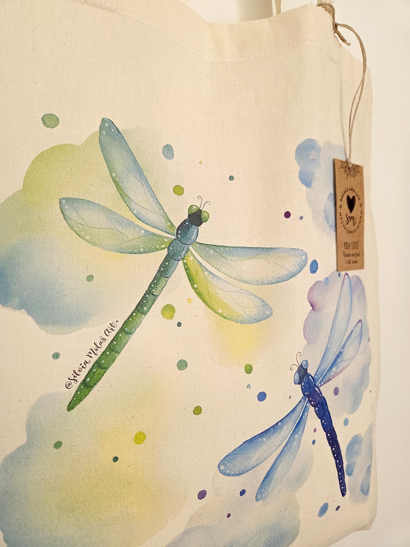 Bossa de cotó 100% (tote bag), en color natural de 140 gr amb la il·lustració ” Libèl·lules “.