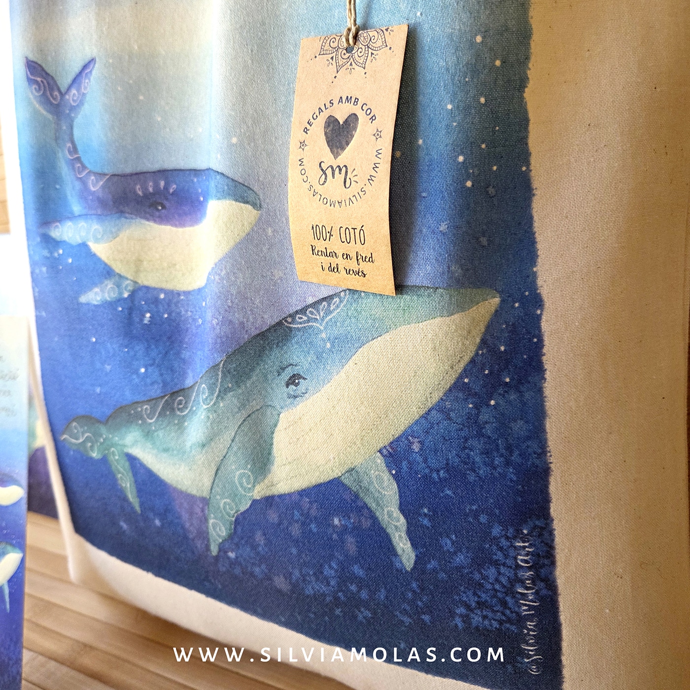 - Bossa de cotó 100% (tote bag), en color natural de 140 gr amb la il·lustració “Balenes”.