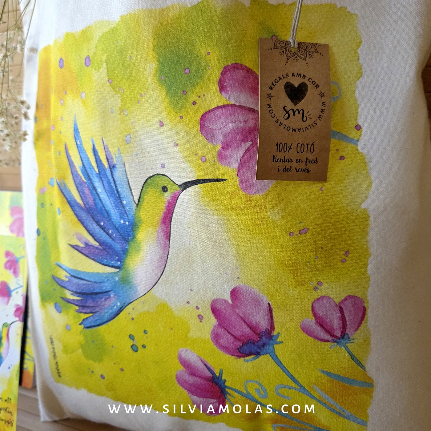 - Bossa de cotó 100% (tote bag), en color natural de 140 gr amb la il·lustració “Colibrí”.