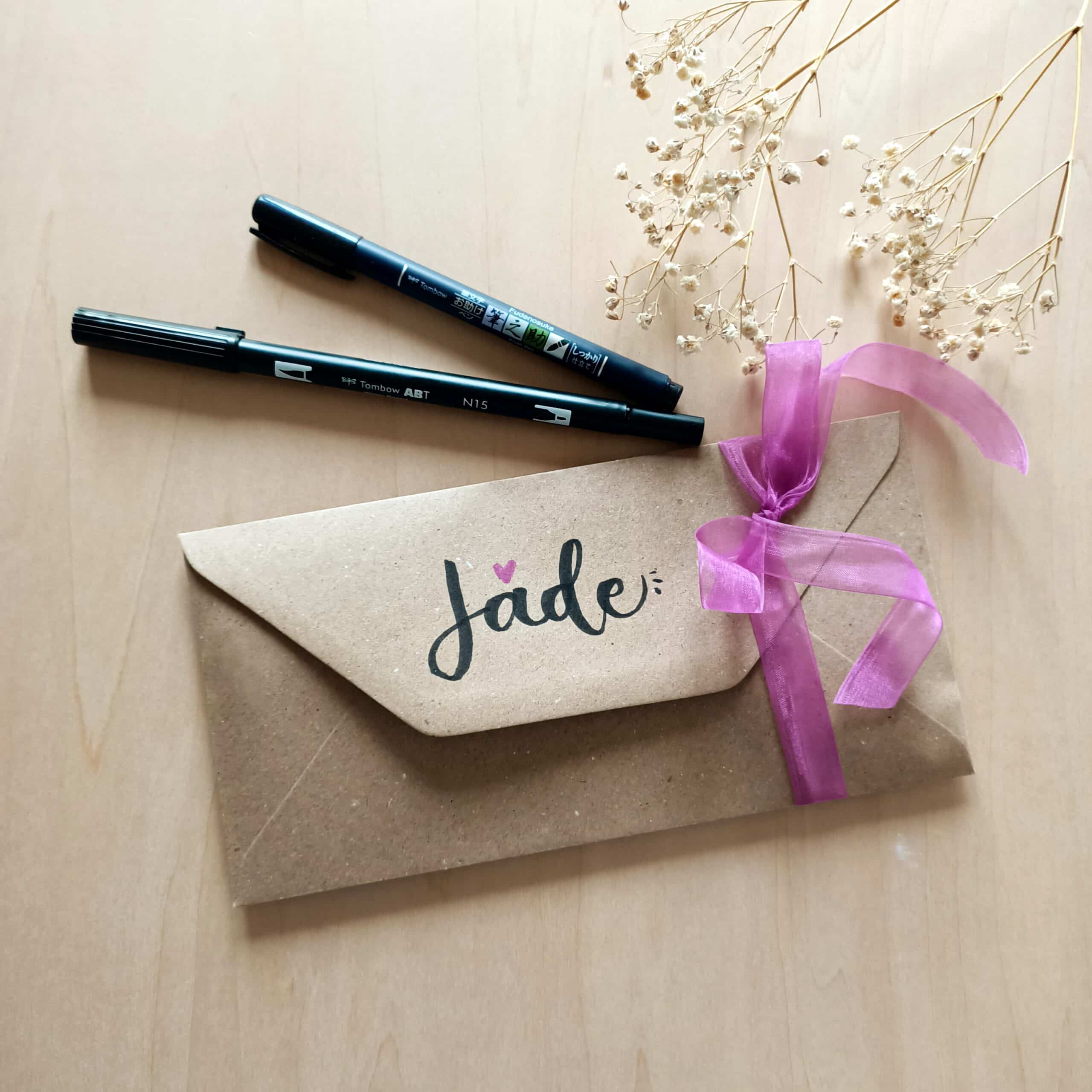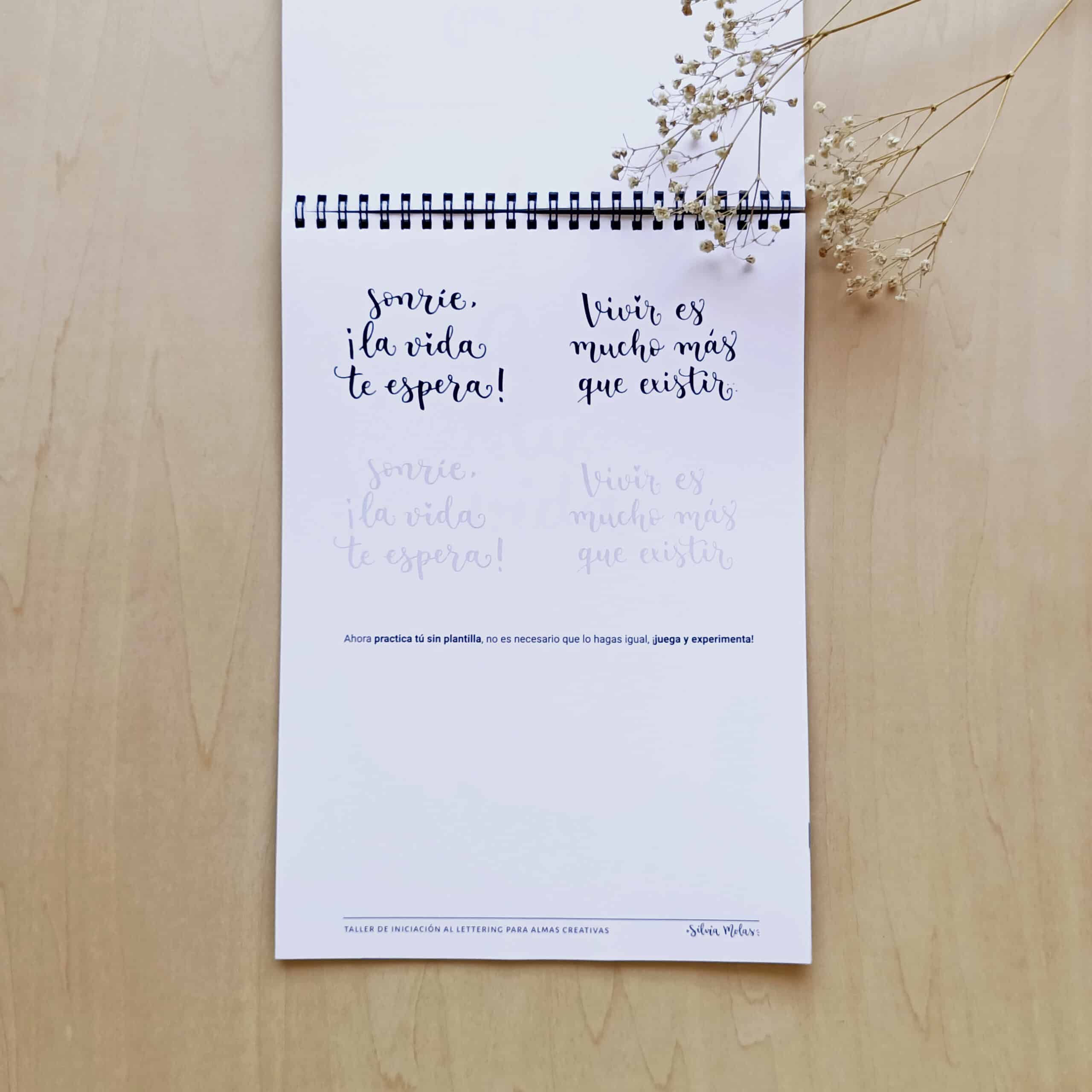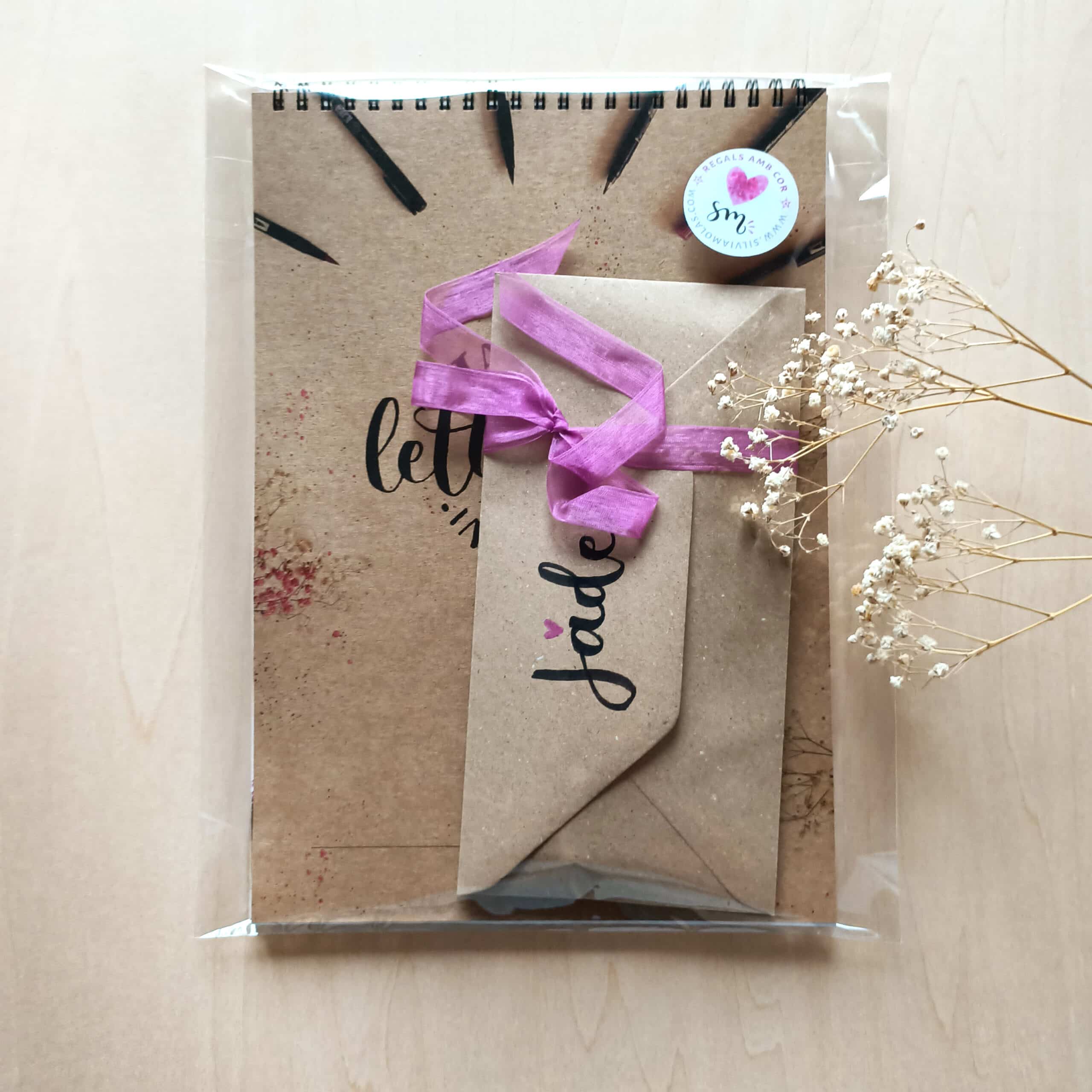 Dossier A4 amb 46 fulls a l’interior (idioma castellà) + 2 rotuladors amb punta de pinzell per fer la pràctica. Els rotuladors s’entreguen dins un sobre personalitzat amb el nom de la persona que rebrà el kit.