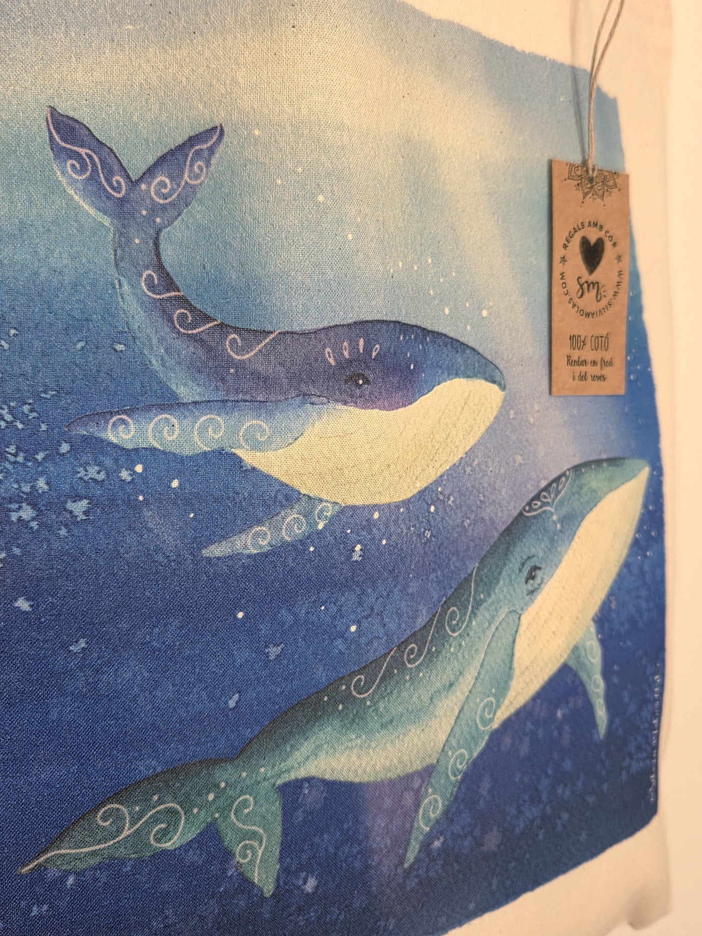 Bolsa de algodón 100% (tote bag) en color natural con la ilustración “Ballenas”.