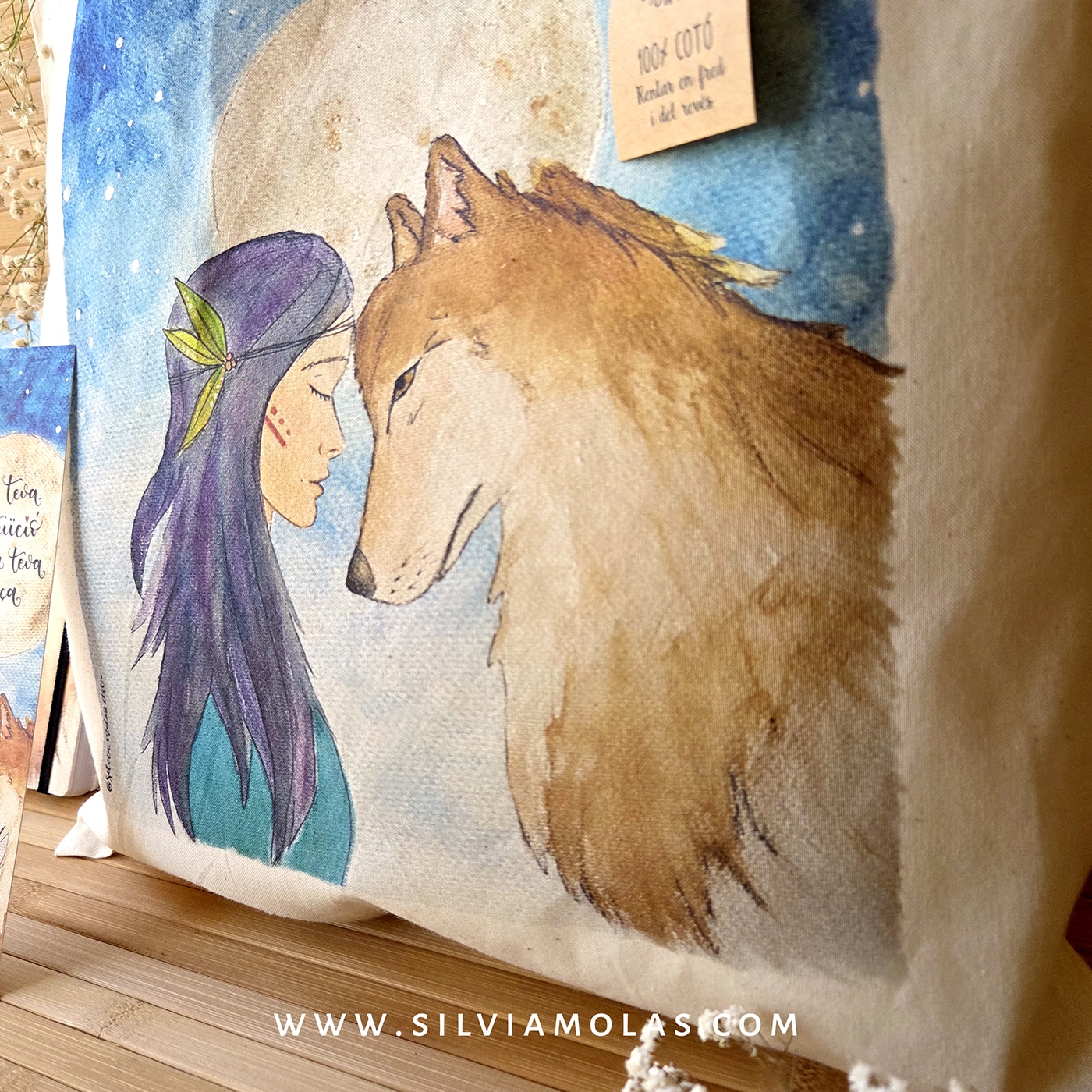 - Bolsa de algodón 100% (tote bag), en color natural de 140 gr con la ilustración “Mujer y lobo”.