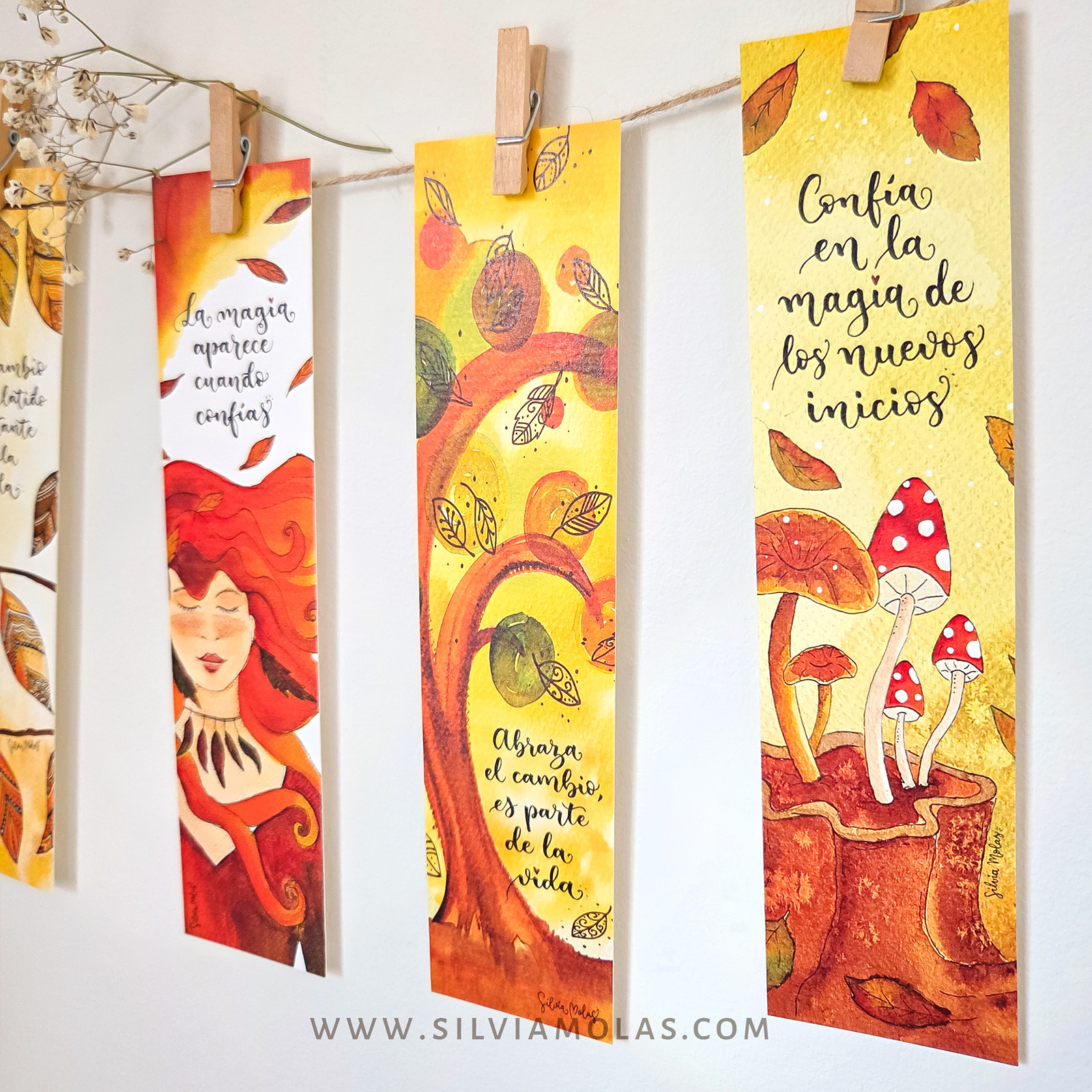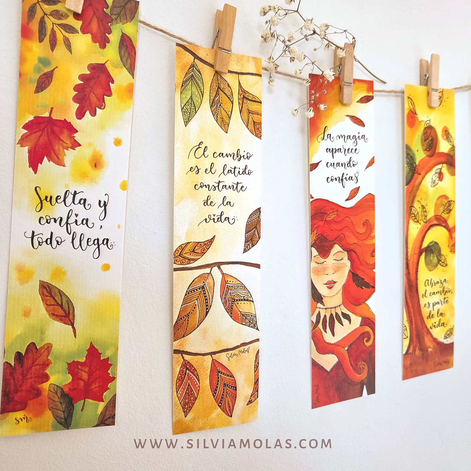 El pack “Otoño” contiene una selección de 5 puntos de libro con frases e ilustraciones de temática otoñal.