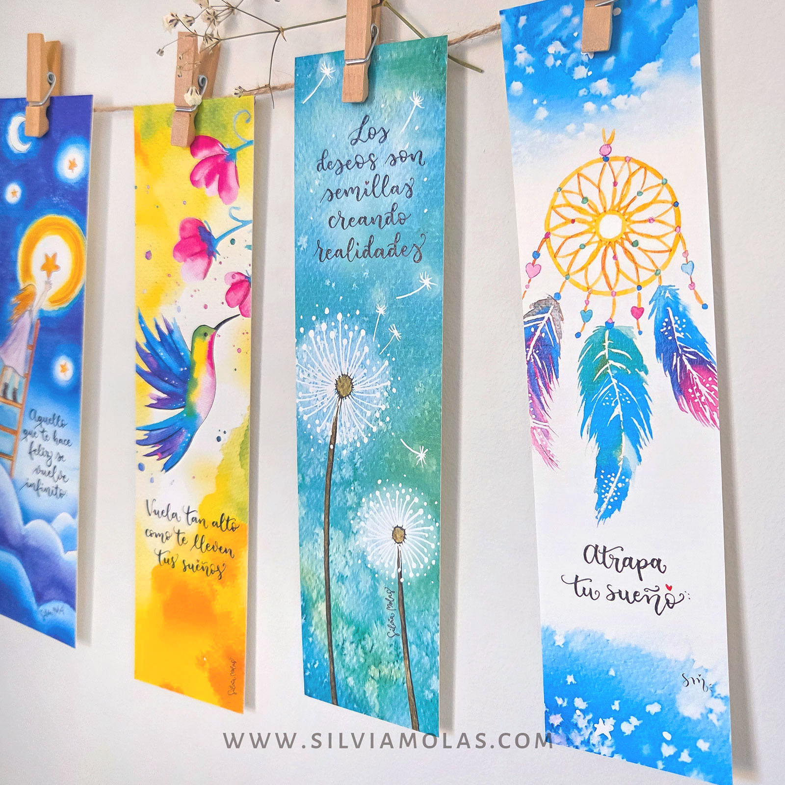 El pack “Sueños” contiene una selección de 5 puntos de libro con frases e ilustraciones que nos invitan a soñar, imaginar, desear y volar.